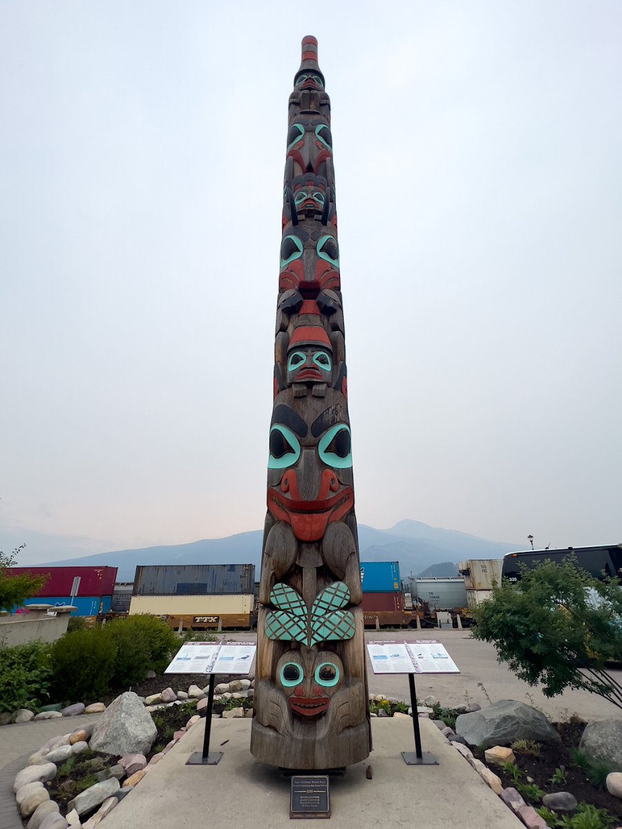 Matthew says this pole may be beautiful, but totem poles aren't even a tradition among First Nations in the Jasper area.